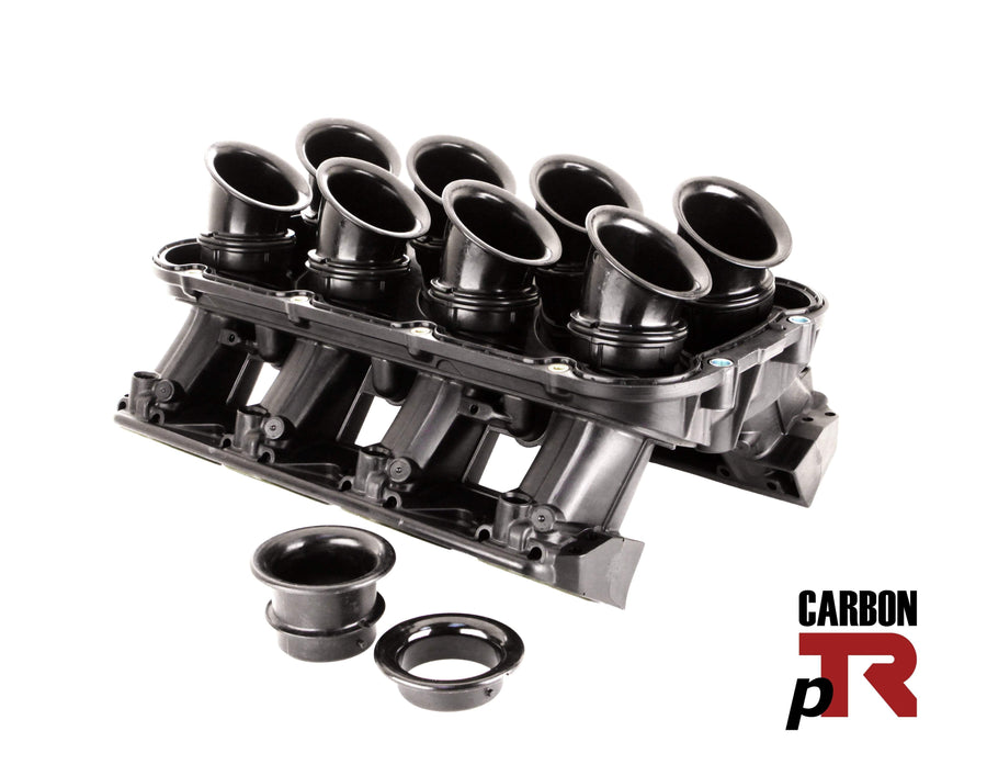 Designed with performance and looks in mind the pTR intake manifold incorporates a hybrid approach with a Nylon Injection molded base with a carbon fiber lid.